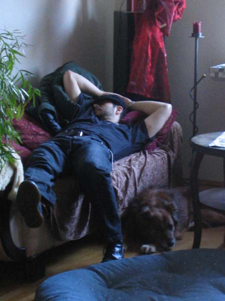 Drummer Phil Maturano taking a nap before the gig, guarded by manager Luzia Fecke's faithful dog Teddy...